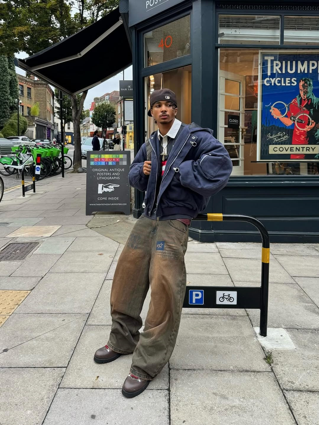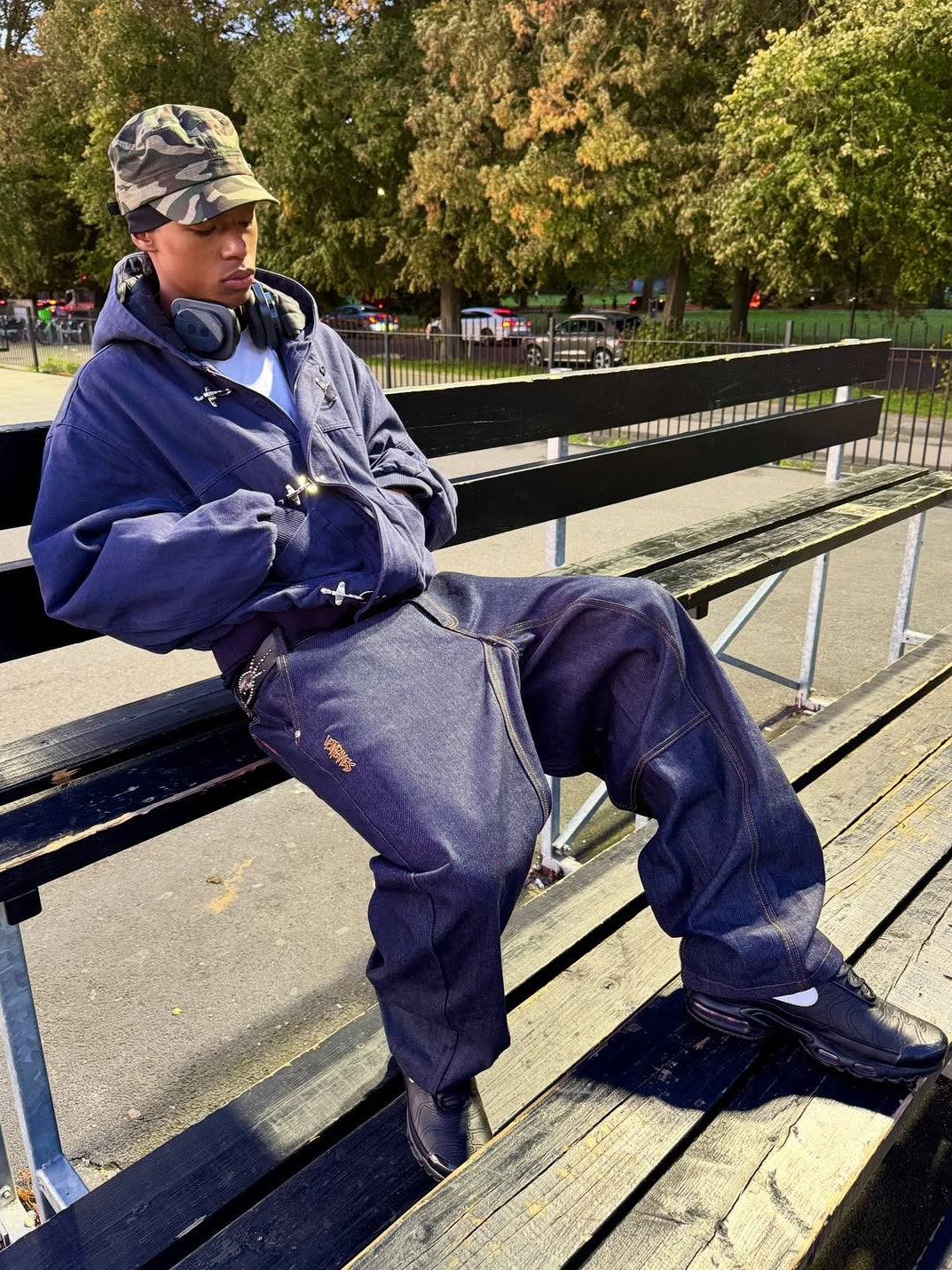 The 15oz Indigo Canvas Clasp Bomber Jacket is crafted from heavy-weight cotton canvas in a deep indigo tone and features a hand-dyed pattern, making each piece uniquely textured and one-of-a-kind. Filled with cotton down and lined with quilted nylon, it offers warmth and comfort, while the oversized cropped fit and heavy-duty metal clasp closure add a modern urban edge. Functional details like the double zip, open-end hip pockets, and bomber-style arm zipper blend utility with style, creating a bold and layered statement piece for the urban explorer who values individuality.